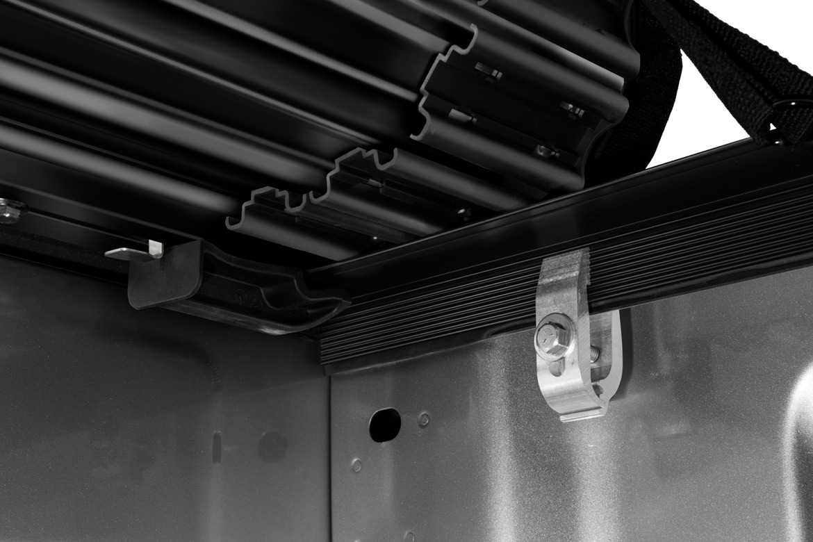 The slam latches at the tailgate allow you to open the cover from either side of the truck. An additional security latch, located towards the center of the truck bed, enhances the security of this cover.